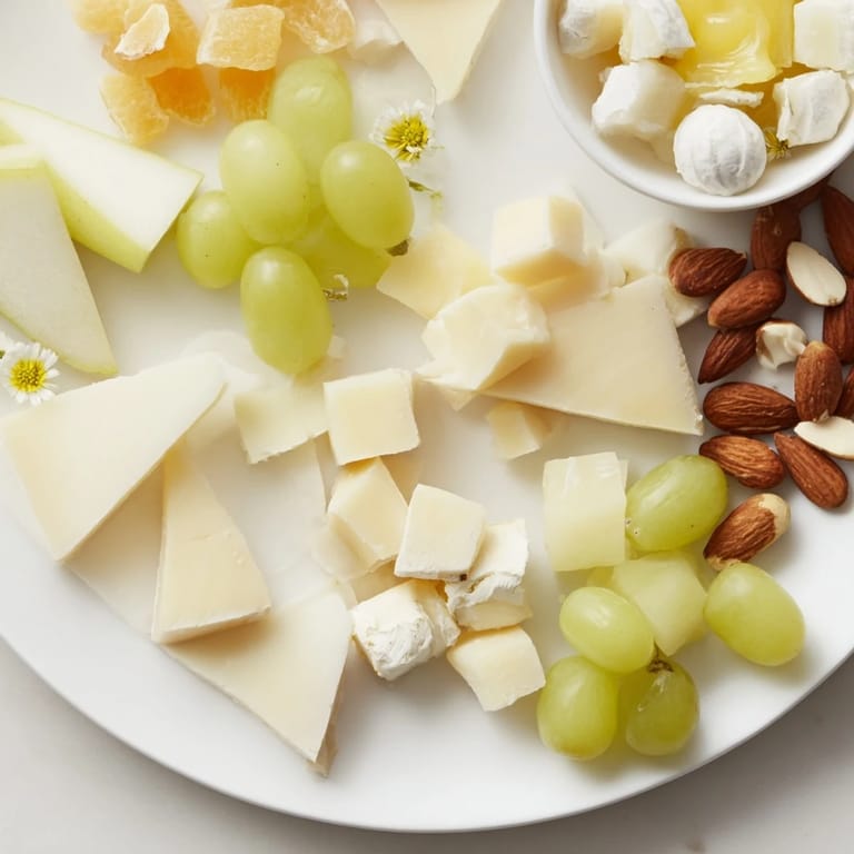 Diese elegante Platte vereint cremige Brie-, Manchego- und Cheddarkäse mit frischen Trauben, Birnen, Ananas und Lychee. Ergänzt durch Marcona-Mandeln, weiße Schokoladentrüffel und knusprige Brezeln entsteht ein harmonisches Geschmackserlebnis. Ein Hauch Zitronencreme und essbare Blüten verleihen eine feine, optisch ansprechende Note. Perfekt zum Servieren mit gut gekühltem Sekt.