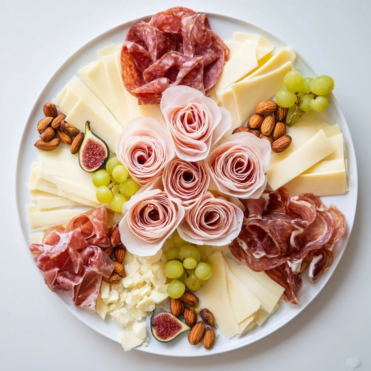 Merken Ein atemberaubendes Charcuterie-Centerpiece mit herzhaften Fleischsorten und handwerklichen Käsen, arrangiert in eleganten Rosenformen, ergänzt durch frisches Obst, Nüsse und Beilagen. Perfekt für Zusammenkünfte oder besondere Anlässe.