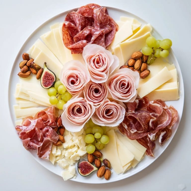 Diese kunstvoll gestaltete Platte kombiniert zarte Fleischscheiben, die zu Rosen geformt werden, mit feinen Käsesorten, frischen Früchten und knusprigen Nüssen. Die Kombination aus salzigen, süßen und nussigen Zutaten schafft ein ausgewogenes Geschmackserlebnis. Ideal für gesellige Abende oder besondere Anlässe, lässt sich die Platte in rund 30 Minuten ohne Kochen zubereiten. Frische Kräuter und essbare Blüten setzen optische Akzente und runden das Erlebnis ab.