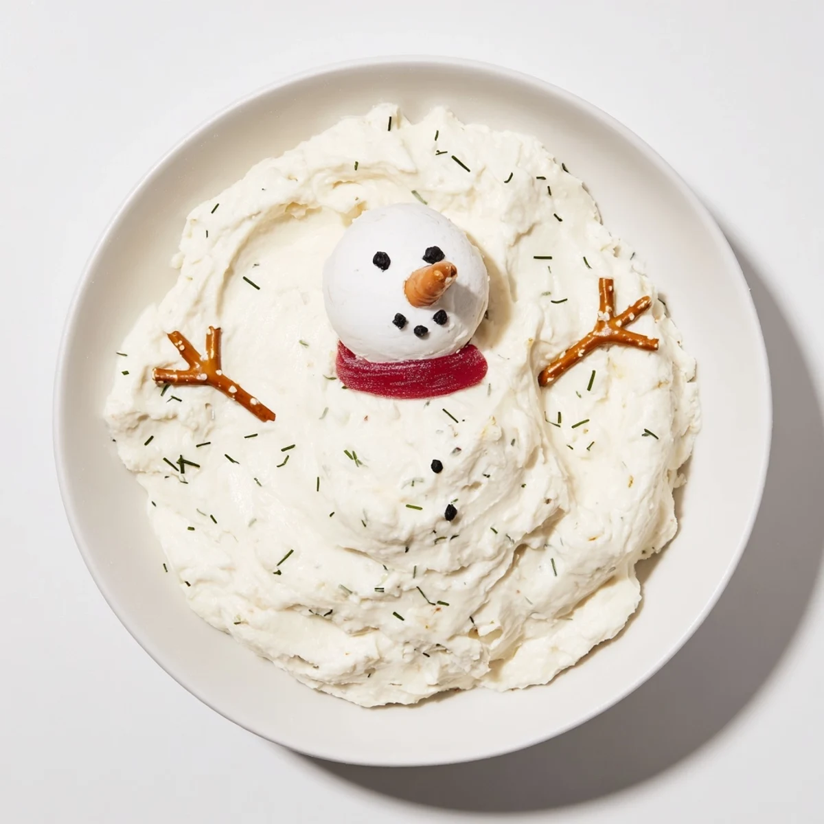Ein spielerischer und cremiger Appetizer mit einem festlichen geschmolzenen Schneemann aus Käse und Joghurt, perfekt für Feiertagsfeiern und ein großer Spaß für Kinder und Erwachsene.