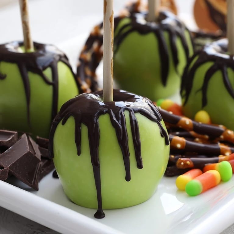 Diese festliche Tafel kombiniert knackige grüne Äpfel mit einer dunklen, glänzenden Glasur, die durch sorgfältiges Erhitzen von Zucker und Farbzusatz entsteht. Umgeben von herzhaften und süßen Begleitern wie Schokoladensoßen, Marshmallows und Kürbiskernen bietet sie eine abwechslungsreiche Genussvielfalt für jede Feier. Einfach vorzubereiten und optisch ein Highlight auf jeder Party. Die Kombination aus fruchtigem, süßem und leicht würzigem sorgt für besondere Geschmacksmomente.