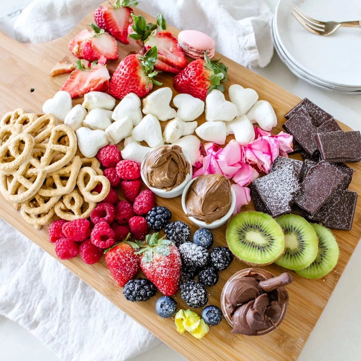 Merken Ein charmantes und romantisches Dessertbrett mit einer Vielzahl von süßen Leckereien, Früchten und Schokolade, gestaltet wie ein Liebesbrief für besondere Anlässe.