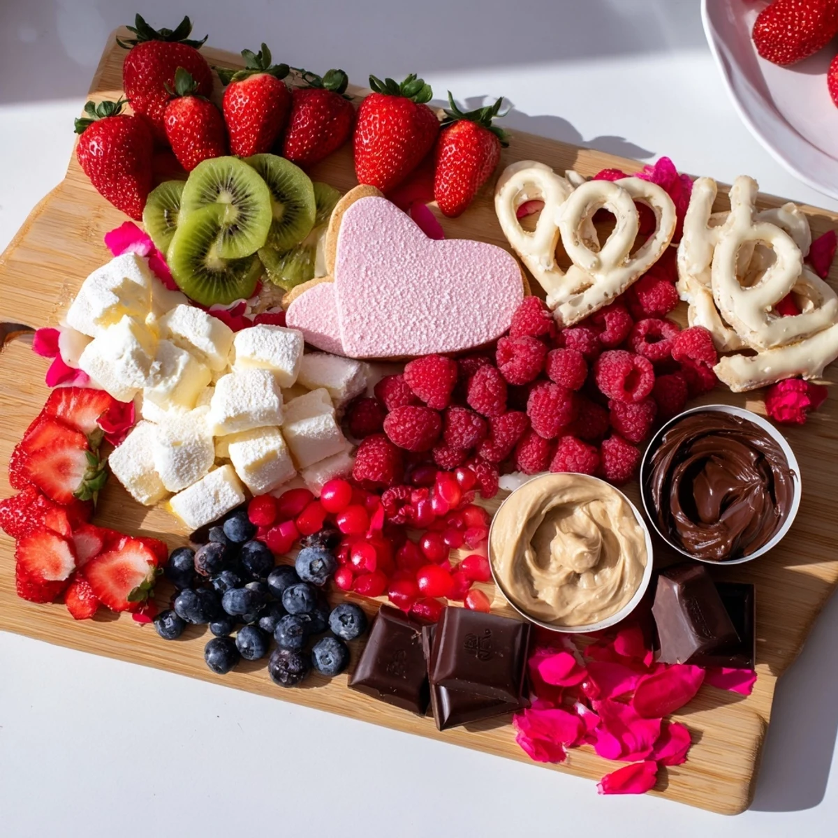 - Garniere das Brett mit essbaren Rosenblättern und bestäube es leicht mit Puderzucker für eine romantische Note.