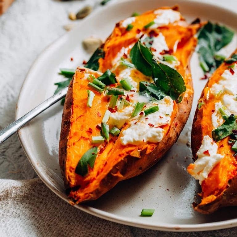 Merken Ein wohltuendes, nahrhaftes Gericht mit zarten, gebackenen Süßkartoffeln, gefüllt mit cremigem Hüttenkäse und frischen Kräutern – perfekt als leichte Hauptspeise oder herzhafte Beilage.