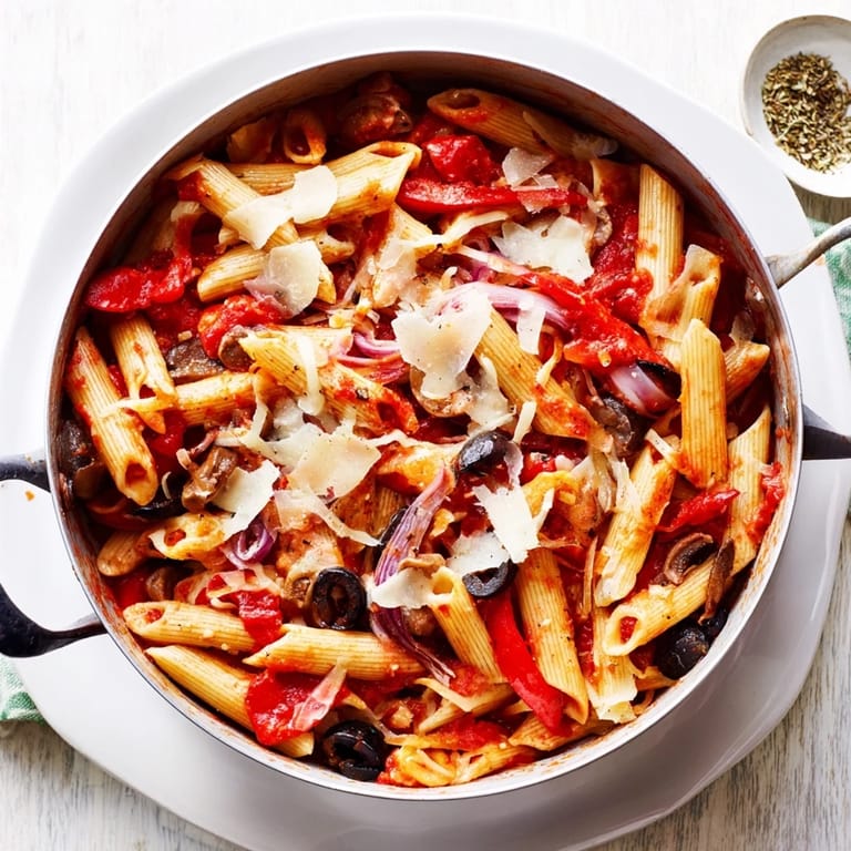 Dieses schnelle Gericht kombiniert kurze Pasta mit würziger Marinara-Soße, Mozzarella und Parmesan in nur einem Topf. Paprika, Zwiebeln, Oliven und optional Pepperoni sorgen für eine vielfältige Geschmackskomposition. Die Zubereitung dauert insgesamt nur 15 Minuten, perfekt für stressige Tage. Gewürze wie Oregano und Basilikum runden das Gericht harmonisch ab. Ideal für Familien oder alle, die eine einfache und geschmackvolle Mahlzeit suchen.