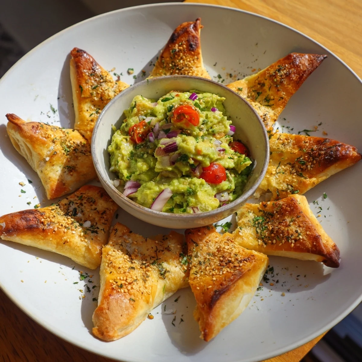 Merken Crispy baked pita chips served with a creamy, zesty guacamole dip—perfect for parties or a savory snack.