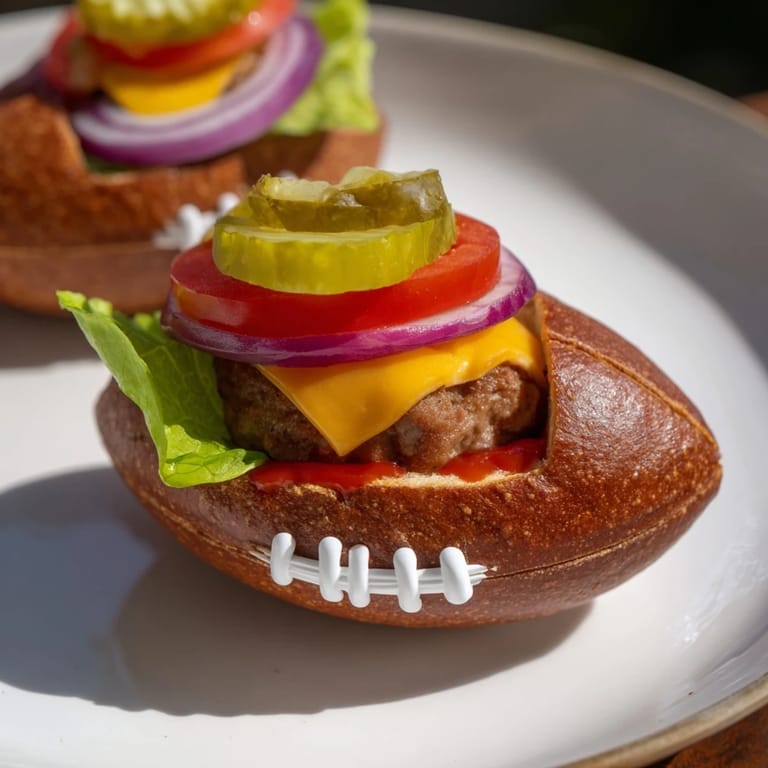 Merken Eine verspielte und herzhafte Platte mit Mini-Burgern in Form von American Footballs – perfekt für Spieltagstreffen oder Motto-Partys.
