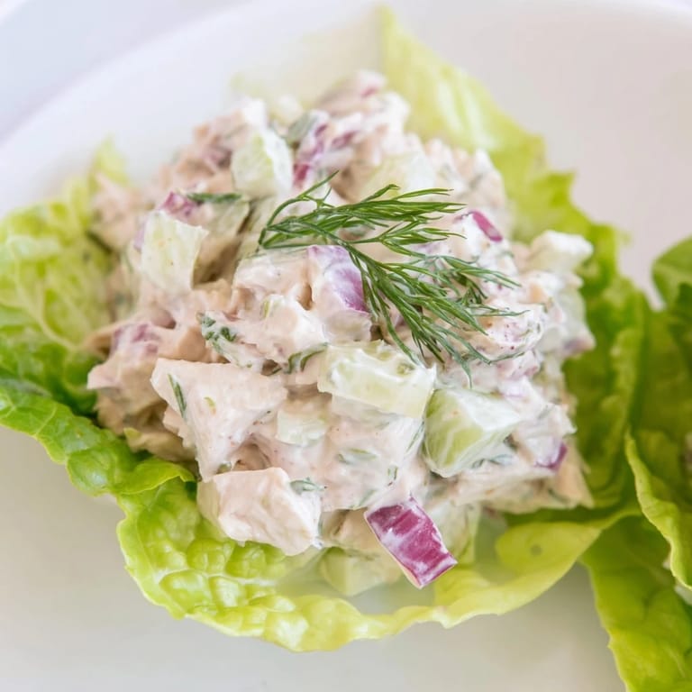 Merken Brighten up your lunch routine with these Dill Pickle Chicken Salad Lettuce Cups. This recipe is a flavor-packed twist on a classic, combining tender chicken with the satisfying crunch of celery and the irresistible tang of dill pickles. Served in fresh butter lettuce leaves, it offers a light, protein-heavy meal that satisfies without the heavy carbs.