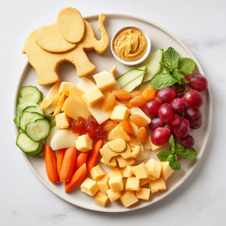 Merken Eine verspielte und auffällige Snack-Platte mit elefantenförmigen Crackern, Käse, Früchten und Dips – perfekt für Partys oder Familientreffen.