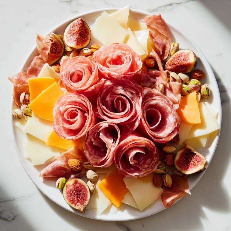 Merken Ein atemberaubendes Charcuterie-Centerpiece mit herzhaften Fleischsorten und handwerklichen Käsen, arrangiert in eleganten Rosenformen, ergänzt durch frisches Obst, Nüsse und Beilagen. Perfekt für Zusammenkünfte oder besondere Anlässe.