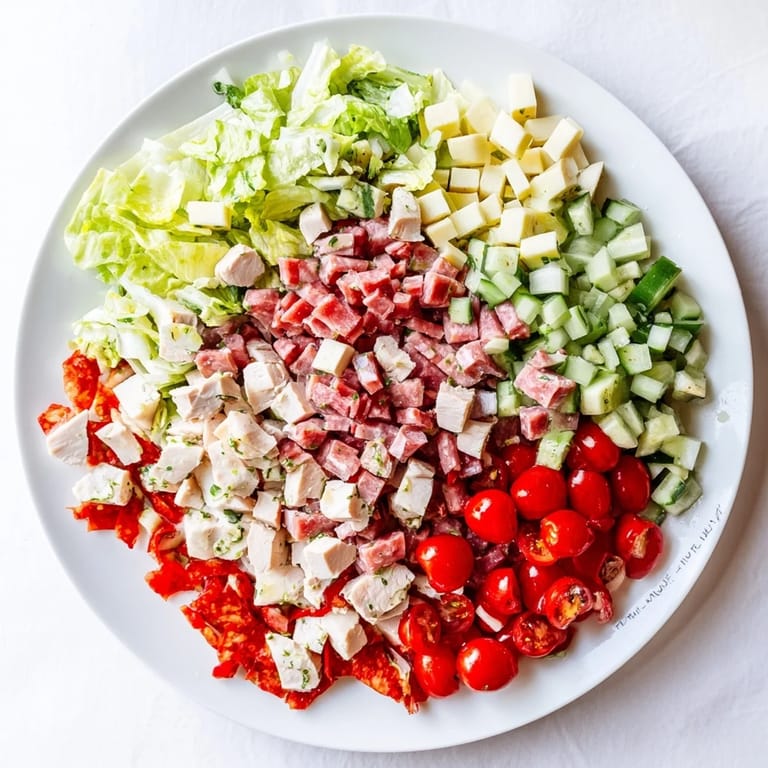 Merken Experience the bold and vibrant flavors of an Italian-American deli right at home with this Italian Deli Chopped Chicken Salad. This hearty and satisfying main dish combines tender chopped chicken, savory salami, and diced provolone cheese with a crisp base of romaine lettuce and fresh vegetables, all brought together by a tangy, herb-infused dressing.