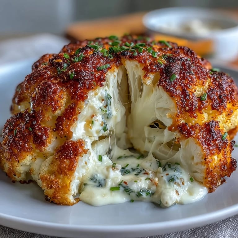 Merken Mein Mitbewohner stand eines Abends in der Küche und starrte auf einen riesigen Blumenkohlkopf, den er vom Markt mitgebracht hatte, mit einem Blick, als hätte er eine Aufgabe bekommen, die unmöglich erschien. Ich fragte, was er damit anfangen wollte, und er zuckte nur mit den Schultern. In diesem Moment kam mir die Idee, ihn zu füllen—nicht mit irgendetwas, sondern mit einer cremigen, käsigen Mischung, die alles verändern würde. Das Ergebnis war spektakulär: ein goldbraun gebackener, dampfender Blumenkohl, der wie ein Kunstwerk auf dem Tisch aussah. Seitdem ist dieses Gericht zu unserem go-to-Rezept für Gäste geworden, denen wir beweisen möchten, dass vegetarisches Essen genauso beeindruckend sein kann wie Fleisch.