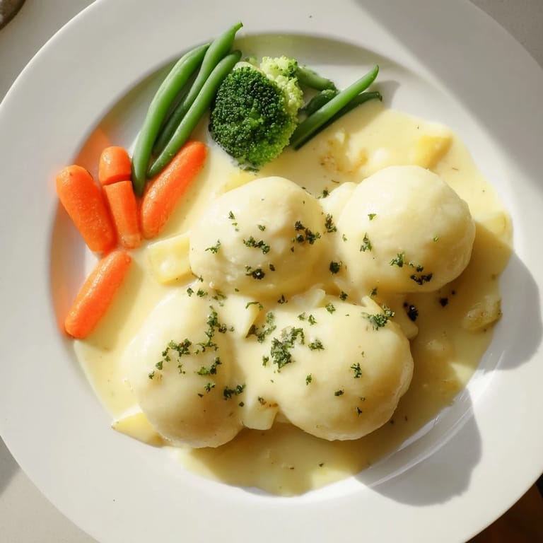 Merken Weiche, kissenartige Kartoffelklöße serviert mit einer seidigen, herzhaften Sauce und einem Gemüse-Mix—ein beruhigender Klassiker der deutschen Hausmannskost.