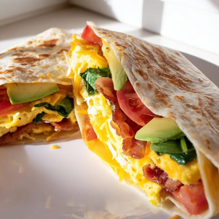 - Imagine the tortilla divided into four quarters and place your ingredients deliberately: scrambled eggs in the first quarter, crumbled bacon in the second, shredded cheese in the third, and then spinach, tomatoes, and avocado slices in the fourth. Don't overfill—restraint here pays off when you're trying to fold.