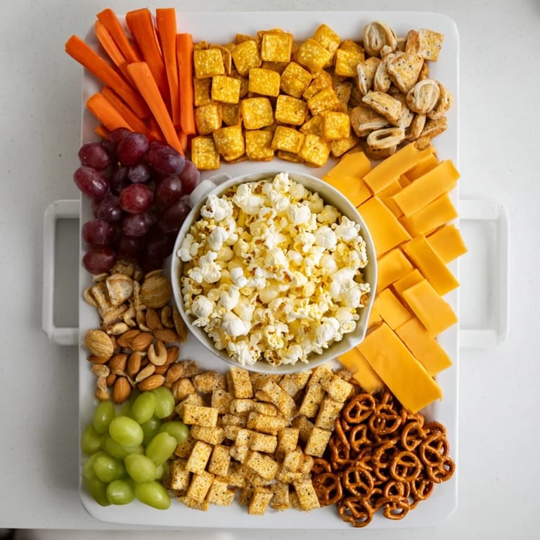 Arrangieren Sie die Zutaten in einem Raster um die Mitte mit Popcorn oder Süßigkeiten, so bleiben die Snacks übersichtlich und griffbereit.