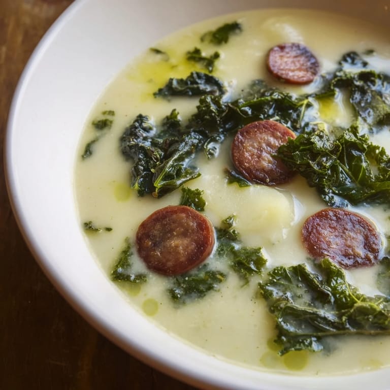 Merken Ich habe Caldo Verde zum ersten Mal an einem kalten Lissabonner Morgen probiert, als mir eine ältere Nachbarin eine dampfende Schüssel über den Zaun reichte. Das grüne, cremige Getränk war so einfach, aber irgendwie vollständig – Kartoffeln, die sich in Butter aufgelöst hatten, dunkle Kohlstreifen und diese leise rauchige Wärme vom Chorizo. Ich bin mit diesem Rezept nach Hause gekommen und habe es immer wieder nachgekocht, jedes Mal überrascht, wie wenig man braucht, um sich so satt und glücklich zu fühlen.