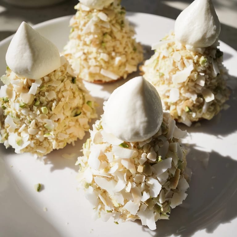 This dessert not only delights the eyes but also enchants the palate with its harmonious blend of textures and flavors. The pistachio-almond sponge offers a subtle richness, while the smooth white chocolate mousse adds a luscious contrast, making each bite a winter wonderland.
